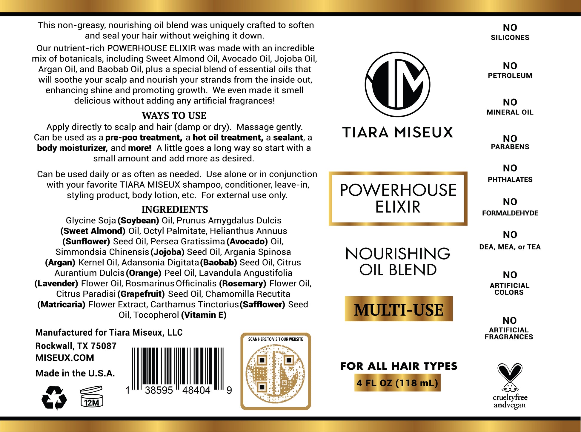 Can be used daily or as often as needed. Use alone or in conjunction with your favorite TIARA MISEUX shampoo, conditioner, leave-in, styling product, body lotion, etc. For external use only.